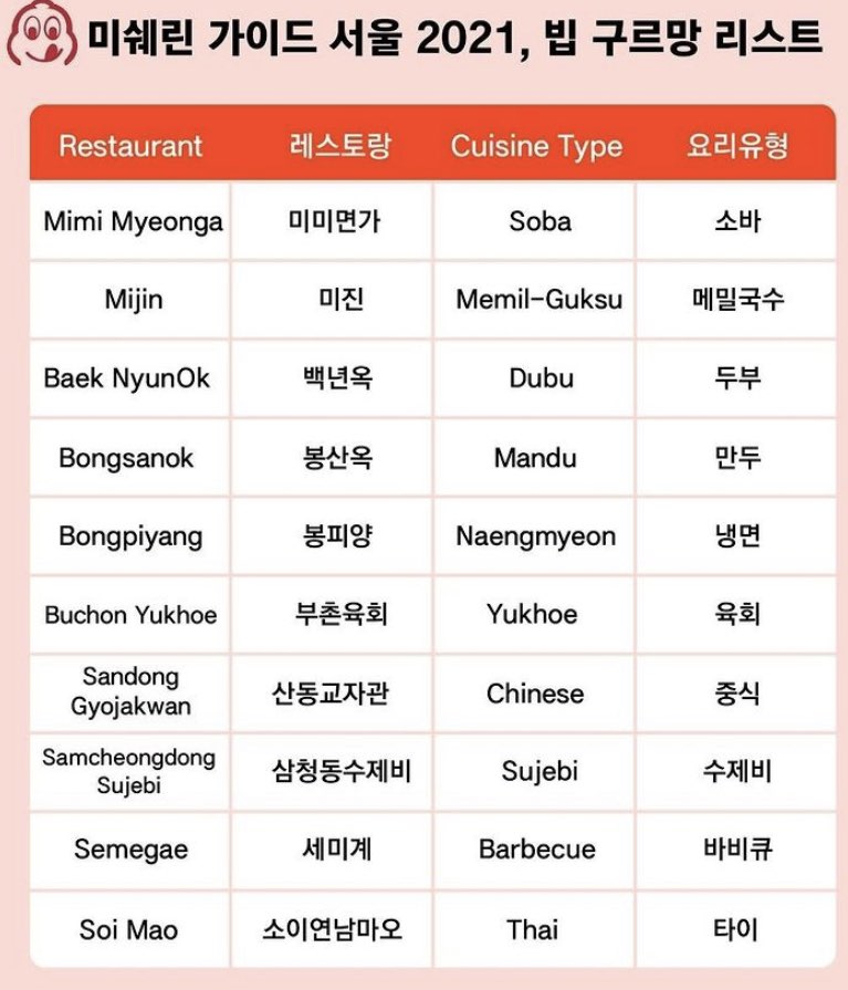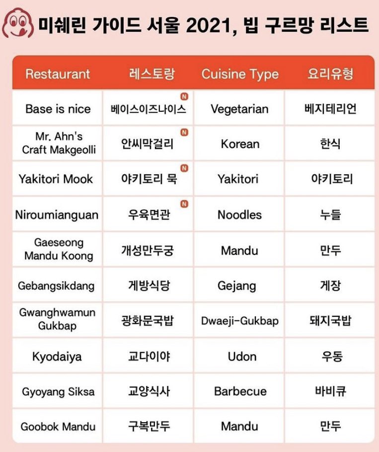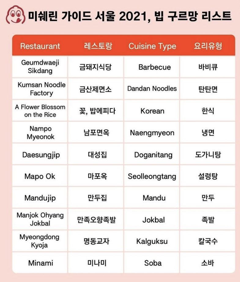 미쉐린 가이드 서울 2021 선정, "빕 구르망" 맛집 리스트 60곳 발매