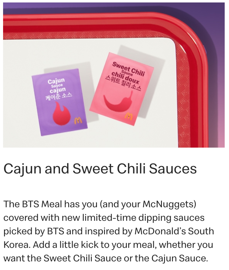 케이준 소시, 스위트 칠리 소스 모두 한국 맥도날드에서부터 inspired 받았다고 한다. 한국에서 직접 공수한건지는 모르겠다.