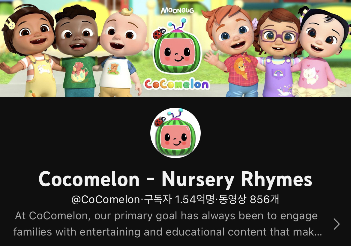 유튜브 채널 코코멜론, 정식명칭은 Cocomelon - Nursery Rhymes 이라는 채널인데요. 총 등록 컨텐츠가 현재 856개, 구독자 1.54 억명이라고 하네요. 네… 1.5억명 이상이네요. ㅋㅋㅋㅋ